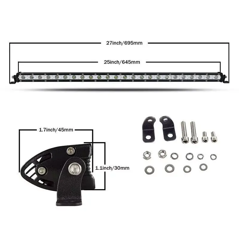 Kompaktná 120W LED jednoradová rampa s dĺžkou 65 cm, ideálna pre offroad vozidlá, traktory a pracovné stroje. Kombinované svetlo (diaľkové + rozptylové), odolné voči vode a prachu (IP67).