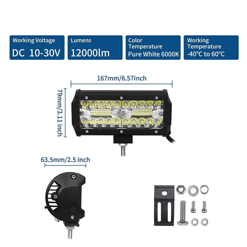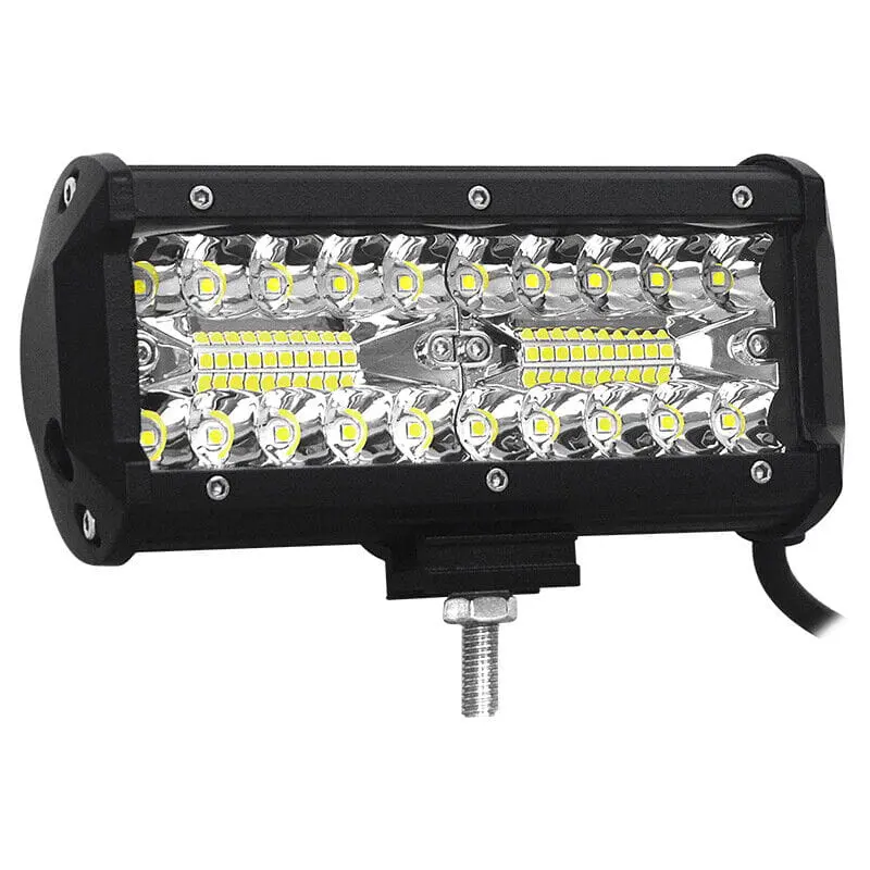 Set dvoch 120W LED pracovných svetiel s dĺžkou 17 cm, kombinované svetlo COMBO (diaľkové + rozptylové), ideálne pre stroje, SUV, traktory a technické vozidlá. Odolné telo, IP67.